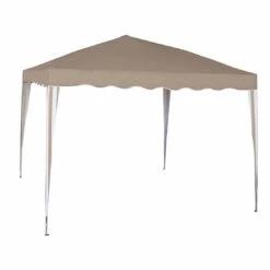Das stabile, korrosionsgeschützte Stahlgestell mit Scherenmechanismus sorgt für einen blitzschnellen Auf- und Abbau. Der 300×300 cm große Faltpavillon darüber hinaus über ein taupefarbenes Dach aus Polyester. Die Beine sind 3-fach höhenverstellbar. Die Arretierung ist dank des Klick-Systems schnell und einfach.