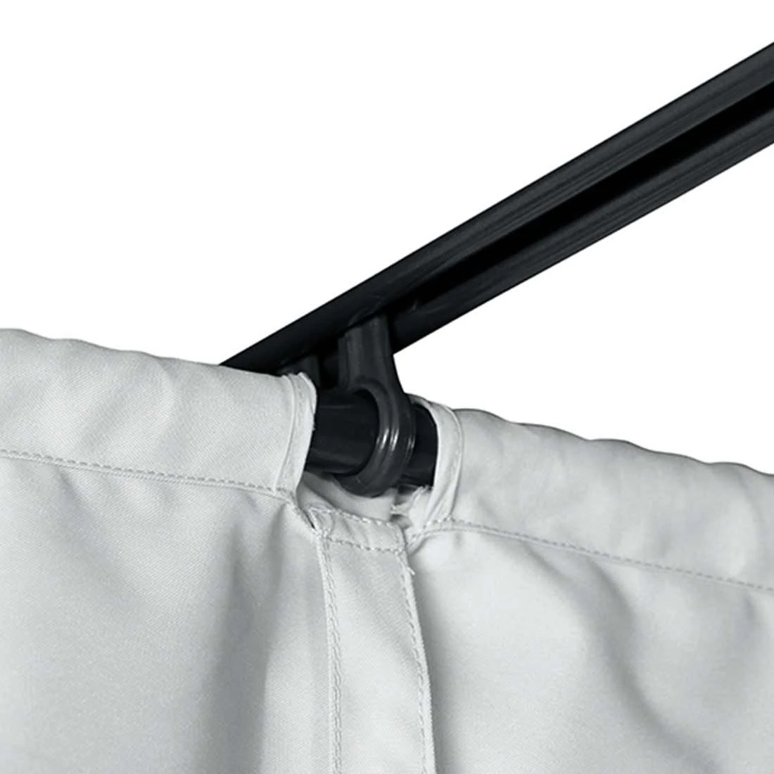Der Clou: Die Stoffbahnen des Daches lassen sich in Wellen zusammenschieben. Geöffnet können Sie einen nahezu freien Blick in den Himmel genießen. Vollständig geschlossen spannt sich das Dach über die gesamte Fläche des Pavillons. Eine fest gespannte Stoffbahn am Ende des Daches dient als Schutz für das zusammengeschobene Dach. Der Bezug kann hier „geparkt“ werden und wird vor herabfallendem Laub und tierischen Exkrementen geschützt.